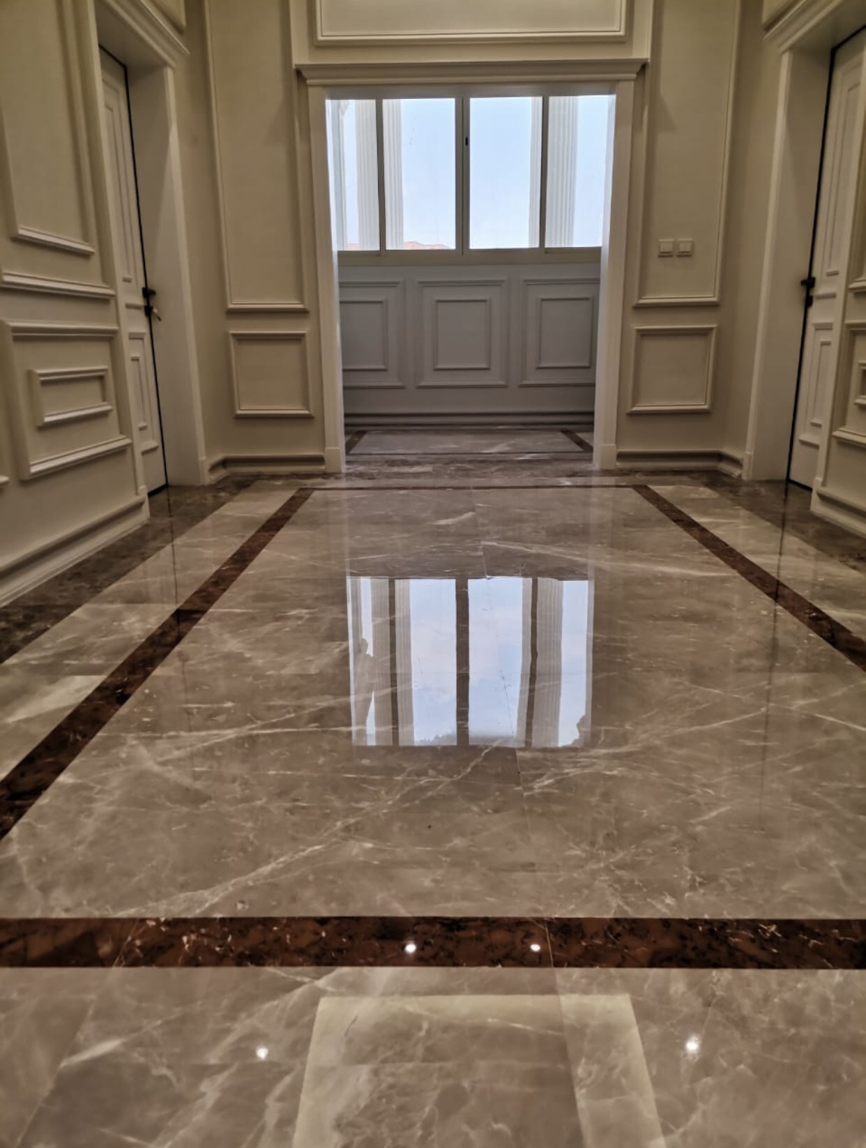 المرحلة النهائية وهي عبارة عن عملية إعادة بلورة سطح الرخام مما يضفي صلابة أكثر ومقاومة أكبر للخدش